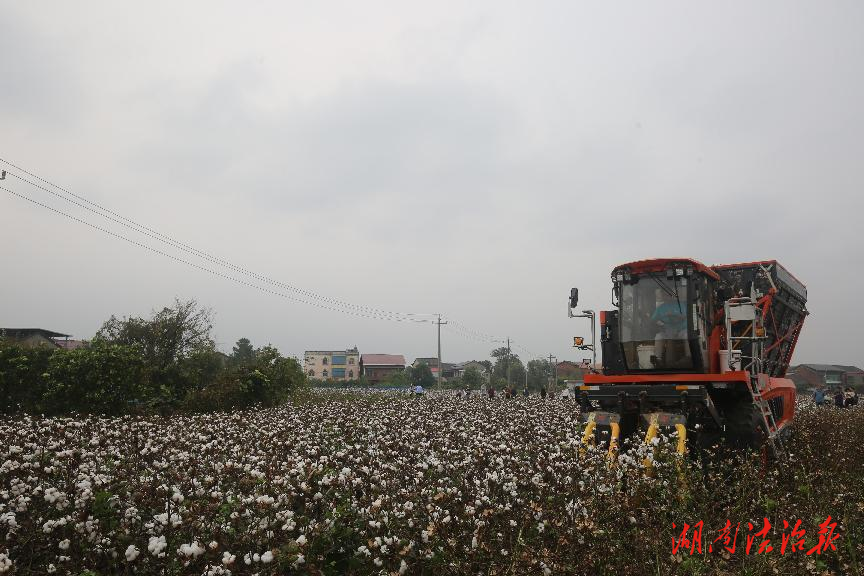 在衡陽(yáng)縣臺(tái)源鎮(zhèn)群向村的千畝棉田里,棉桃競(jìng)相綻放,吐出朵朵白絮。伴隨著陣陣轟鳴聲,只見(jiàn)一臺(tái)高約4米、寬近2米的采棉機(jī),張開(kāi)前方的2個(gè)大叉子駛進(jìn)田中,大叉子內(nèi)的幾十個(gè)螺紋鐵鉤不停旋轉(zhuǎn),精準(zhǔn)地將棉桃里的白花勾出,再通過(guò)強(qiáng)力風(fēng)機(jī)吸走,最后聚攏在采棉機(jī)后面的大斗廂里。與會(huì)人員駐足觀摩,詳細(xì)了解棉花機(jī)收的操作流程、技術(shù)應(yīng)用及設(shè)備運(yùn)行情況,實(shí)地感受機(jī)采棉帶來(lái)的高效與便捷。