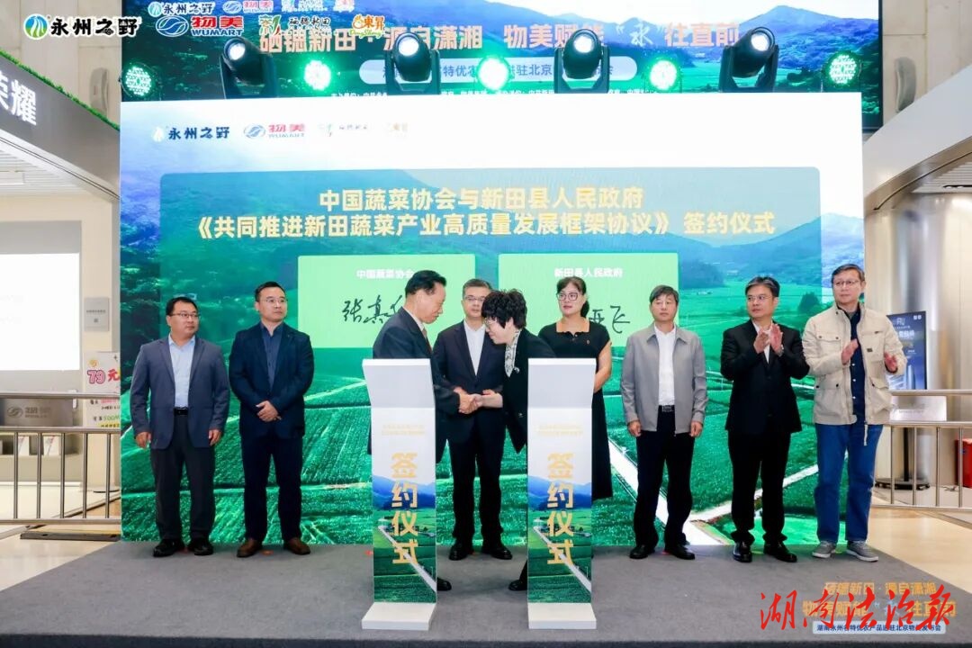 東升農(nóng)場、新田五月豆香有限公司、新田陶嶺三味辣椒產(chǎn)業(yè)協(xié)會(huì)相關(guān)負(fù)責(zé)人分別作了永州蔬菜、大豆系列產(chǎn)品、三味辣椒地標(biāo)推介;北京物美綜合超市有限公司與新田縣人民政府、新田優(yōu)質(zhì)企業(yè)代表,中國蔬菜協(xié)會(huì)與新田縣人民政府,中國農(nóng)業(yè)大學(xué)食品科學(xué)與營養(yǎng)工程學(xué)院與湖南雙牌尚道生物科技有限公司、長沙銀行永州分行簽訂戰(zhàn)略合作協(xié)議。