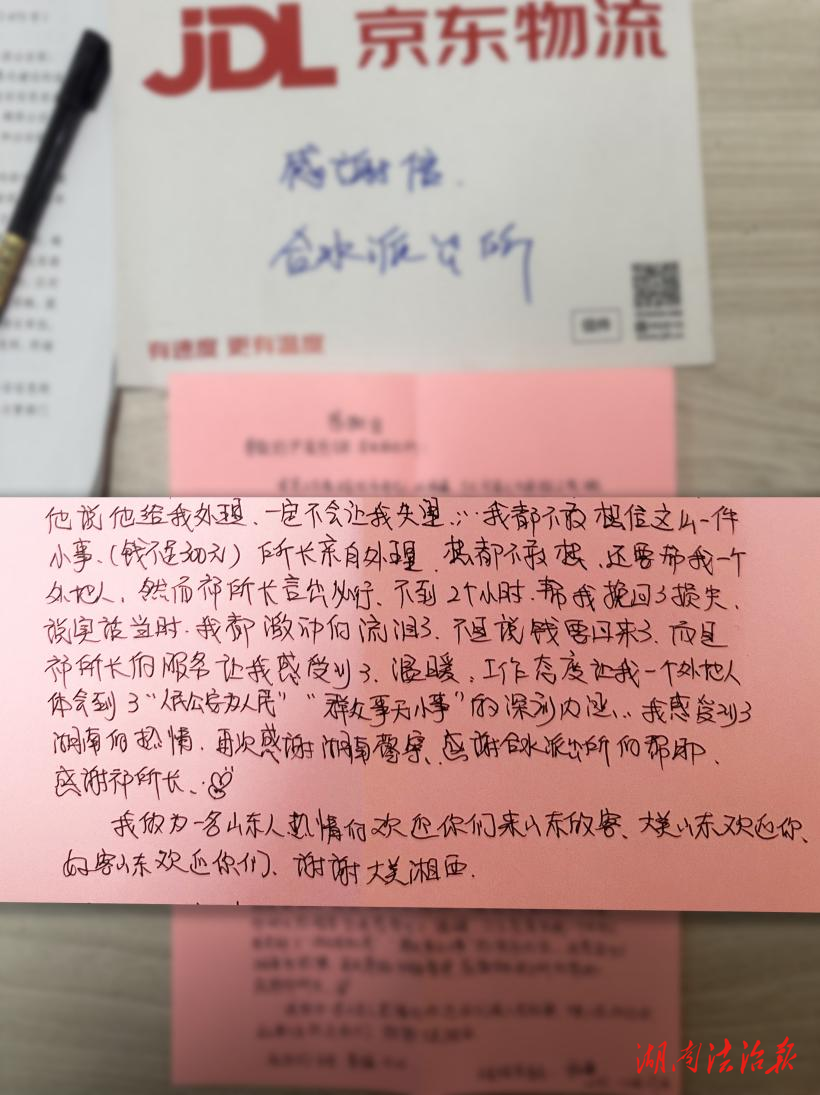 湖南法治報(bào)訊(通訊員 李童 龔興)?1月6日,瀘溪縣公安局合水派出所收到一份跨越千里的特殊禮物—一面從山東省濰坊市寄來的錦旗和一封情真意切的感謝信,這份遠(yuǎn)道而來的謝意,背后是一個(gè)關(guān)于“信任”與“守護(hù)”的溫暖警民故事。