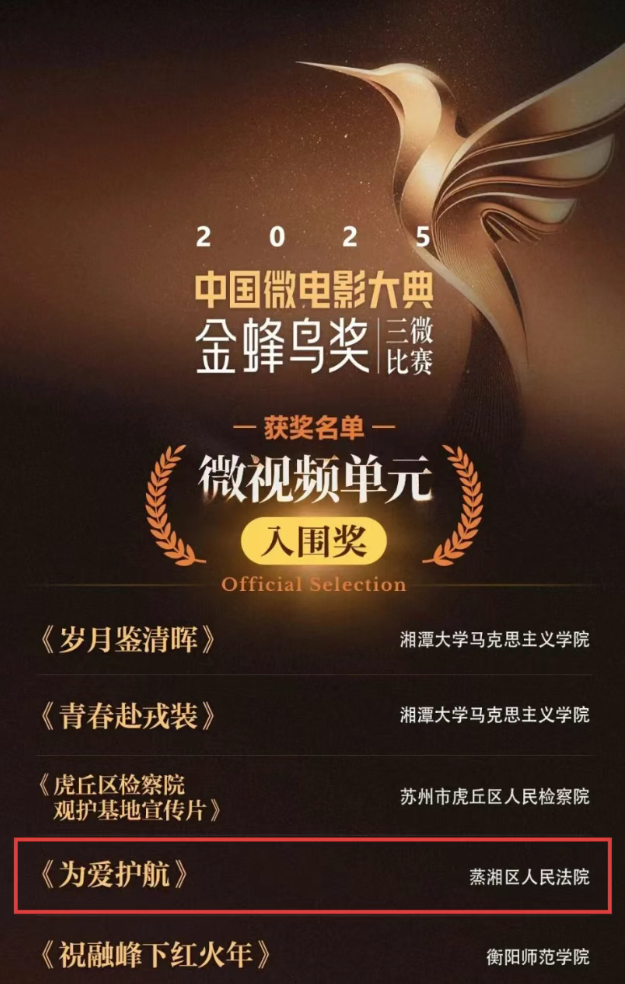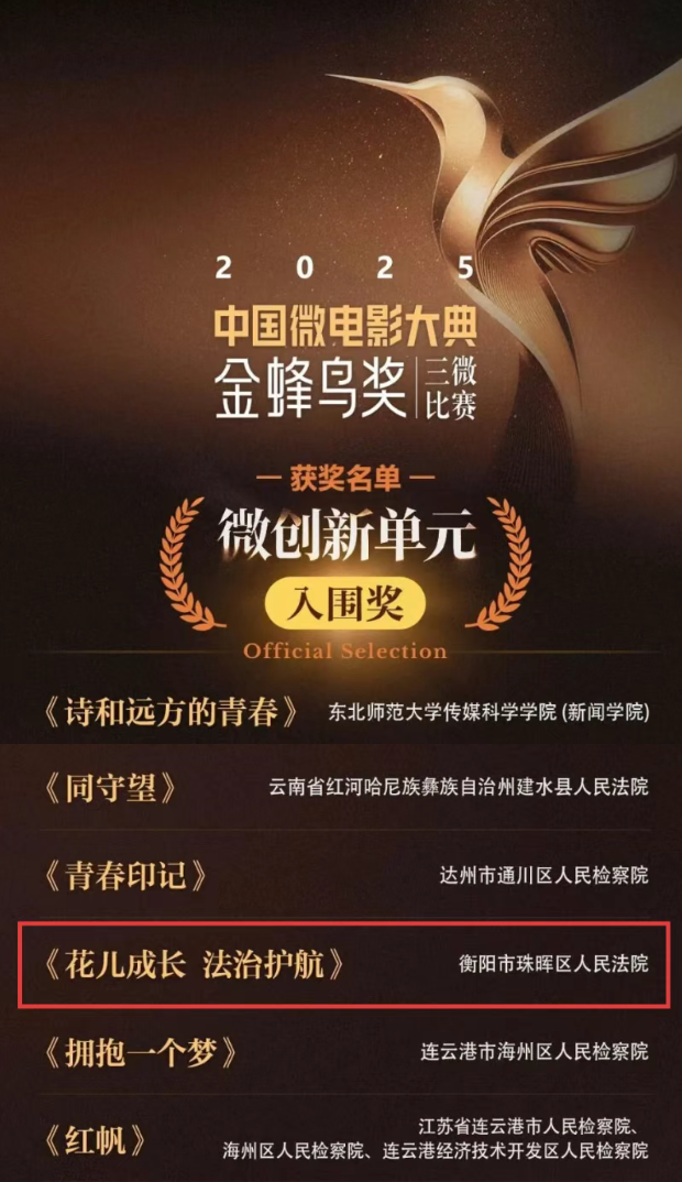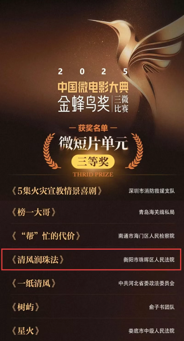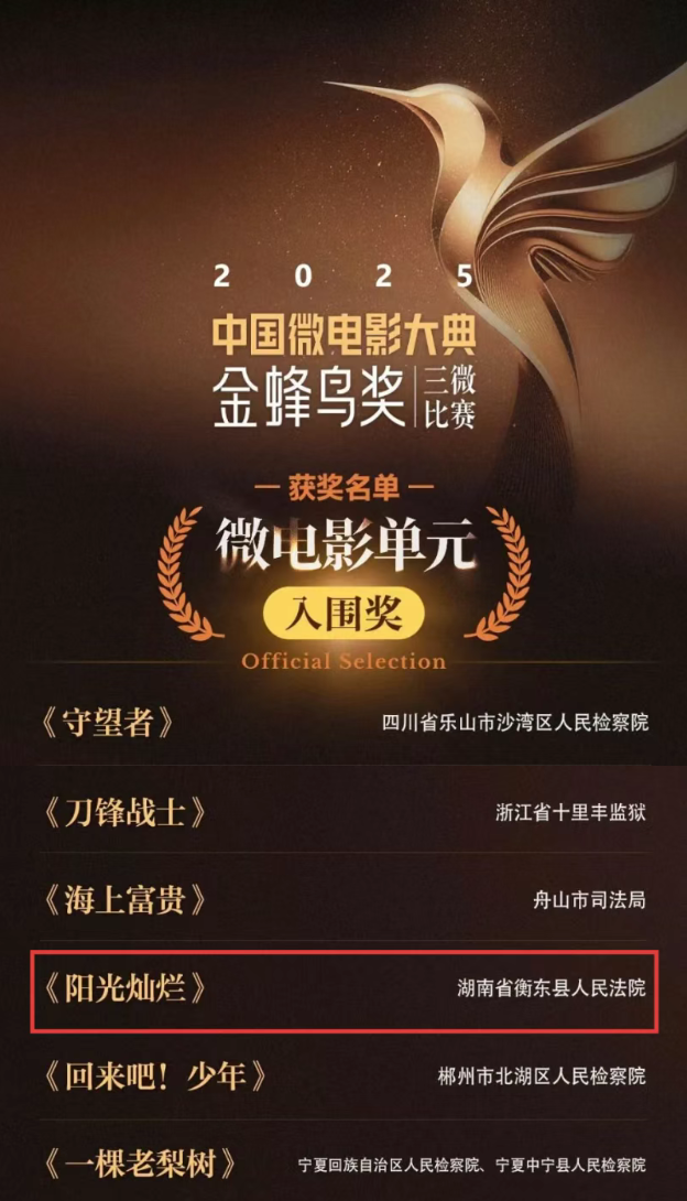 豐收!衡陽法院7部作品榮獲中國(guó)微電影大典“金蜂鳥獎(jiǎng)”