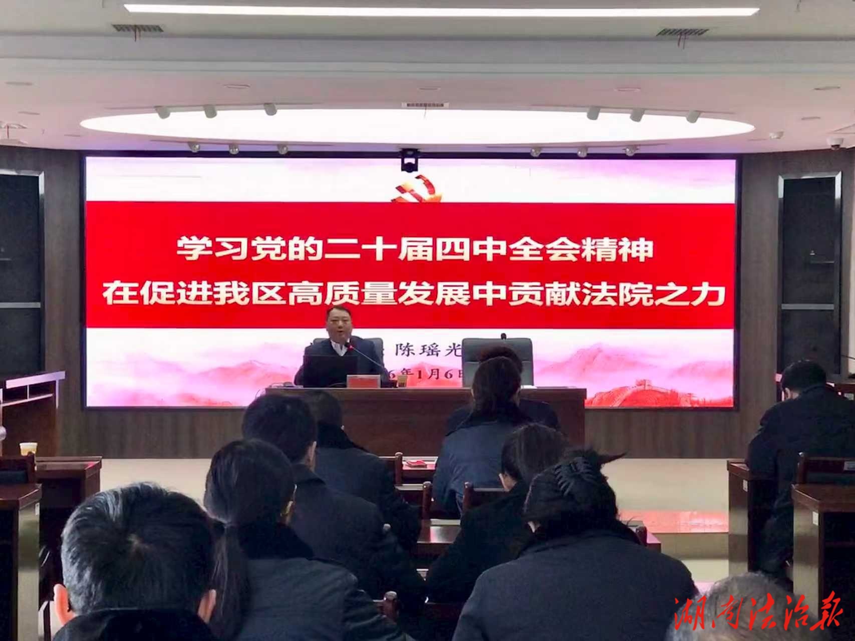 湖南法治報訊(通訊員 李倩)為深入學(xué)習(xí)貫徹黨的二十屆四中全會精神,為新一年法院工作高質(zhì)量發(fā)展開好局、起好步,奠定堅實的思想基礎(chǔ)和業(yè)務(wù)根基,1月6日,南岳區(qū)人民法院組織召開全院干警集中學(xué)習(xí)大會,邀請區(qū)委宣講團成員、區(qū)委統(tǒng)戰(zhàn)部常務(wù)副部長陳瑤光作專題宣講。黨組書記、院長李湘銀出席會議并講話,全院干警參加學(xué)習(xí)。