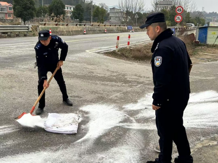 針對國省道、鄉(xiāng)村公路路況復(fù)雜、管控難度大的特點(diǎn),各派出所同步啟動巡邏模式,以“車巡+步巡”相結(jié)合的方式,對轄區(qū)重點(diǎn)路段開展拉網(wǎng)式排查,及時清理路面積雪、鏟除薄冰,設(shè)置警示標(biāo)志提醒過往車輛注意安全。1月21日清晨7時許,天剛蒙蒙亮,靈官殿派出所民輔警已攜帶融雪鹽、鐵鍬等工具,奔赴轄區(qū)主要路段開展除冰作業(yè)。寒風(fēng)中,民輔警們分工協(xié)作,將融雪鹽均勻撒向結(jié)冰路面,用鐵鍬清理路側(cè)積雪,即便警服被雪花浸透、雙手被寒風(fēng)凍紅,仍堅守崗位直至路面通行條件得到有效改善,用實(shí)際行動為鄉(xiāng)村群眾出行掃清障礙。