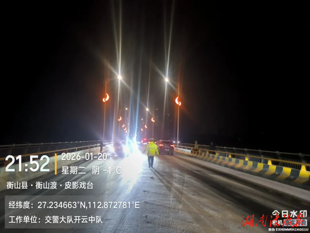 1月20日晚,交警大隊民警在衡山縣湘江大橋指揮車輛分流,協(xié)助衡山縣公路養(yǎng)護中心拋撒融雪劑、開展除冰作業(yè),并安排警力在通行車道全程護航,提醒過往車輛放慢速度,全力守護城區(qū)道路安全。
